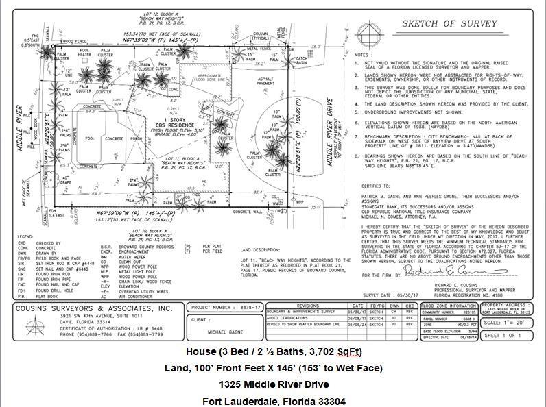 MIDDLE RIVER WATERFRONT. 100' X 145', 14,500 Square Foot Lot on 260' width of Middle River. Ocean access, subject to Sunrise bridge. Build your dream estate or remodel existing home that needs major renovations. Bayview School District. AS IS with no repairs. See survey and aerial photos attached. See 360 view in virtual tour.