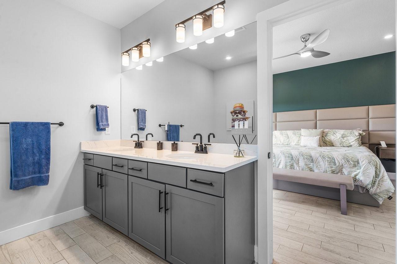 Supplements: Welcome Home to this "better than new' 3 bedroom 2.5 bath townhome in the gated community of Oak Tree. This home features open concept living on the main level including a gourmet kitchen, Kitchen-Aid appliances, large island. built-in pantry with extra storage and wood grained tile floors throughout. The new wood and metal staircase leads up to your large primary bedroom with custom walk-in closets and a primary bath with separate tub and glass enclosed shower. The separate laundry room, second bath and two other bedrooms, with custom closets, share the upstairs floor. This is a complete "smart" home with motorized shades, LED smart recessed lighting throughout, built-in rear speakers in living room, Ecobee thermostat and tankless water heater. The extended patio overlooking the canal is just what you've been needing to relax. Call today for your private showing.