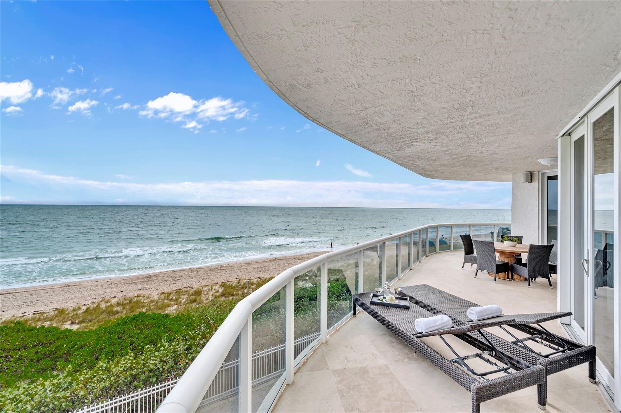 Beach House vibe in this exquisite residence embraced by sand & sea at L'Hermitage-premier luxury gated comm. w/ over 10 acres of prime oceanfront. This corner residence just above the sand, provides direct access to the pool & recreation deck located on the same fl. Incredible wraparound terrace w/ unobstructed views of the ocean waves.Open kitchen w/ island & breakfast nook framed by spectacular ocean views complemented by reflective ceilings in living area. Upon arriving home enjoy direct elevator access from lobby, opening into private foyer w/ stylish glass entry door. Resort-style amenities incl: tennis courts, poolside caf, concierge, each attendant, pet park & more. 2 pets are welcome. Included 2 parking spaces & valet serv. Main. fee incl. a credit at L'Hermitage Bar & Grill