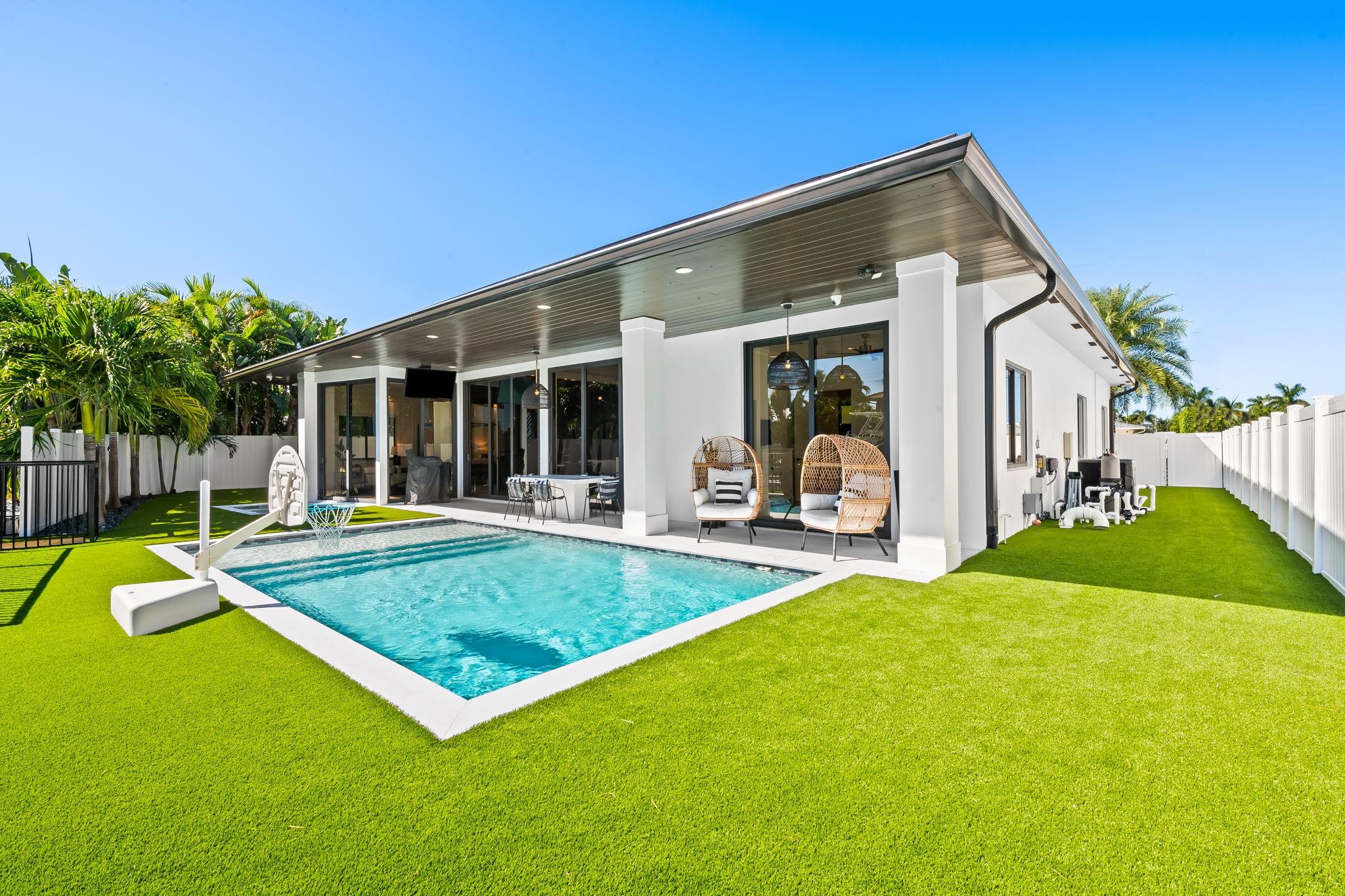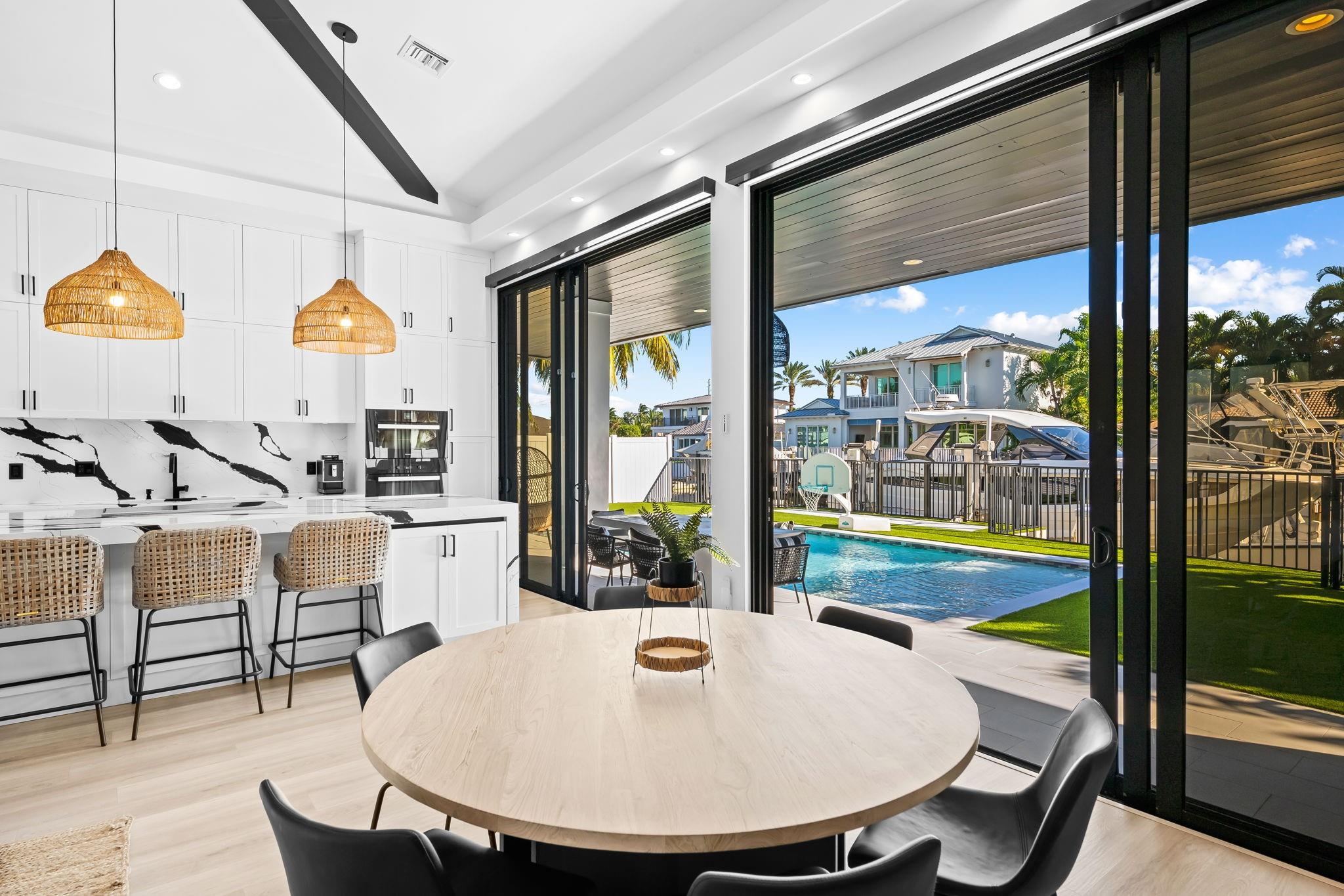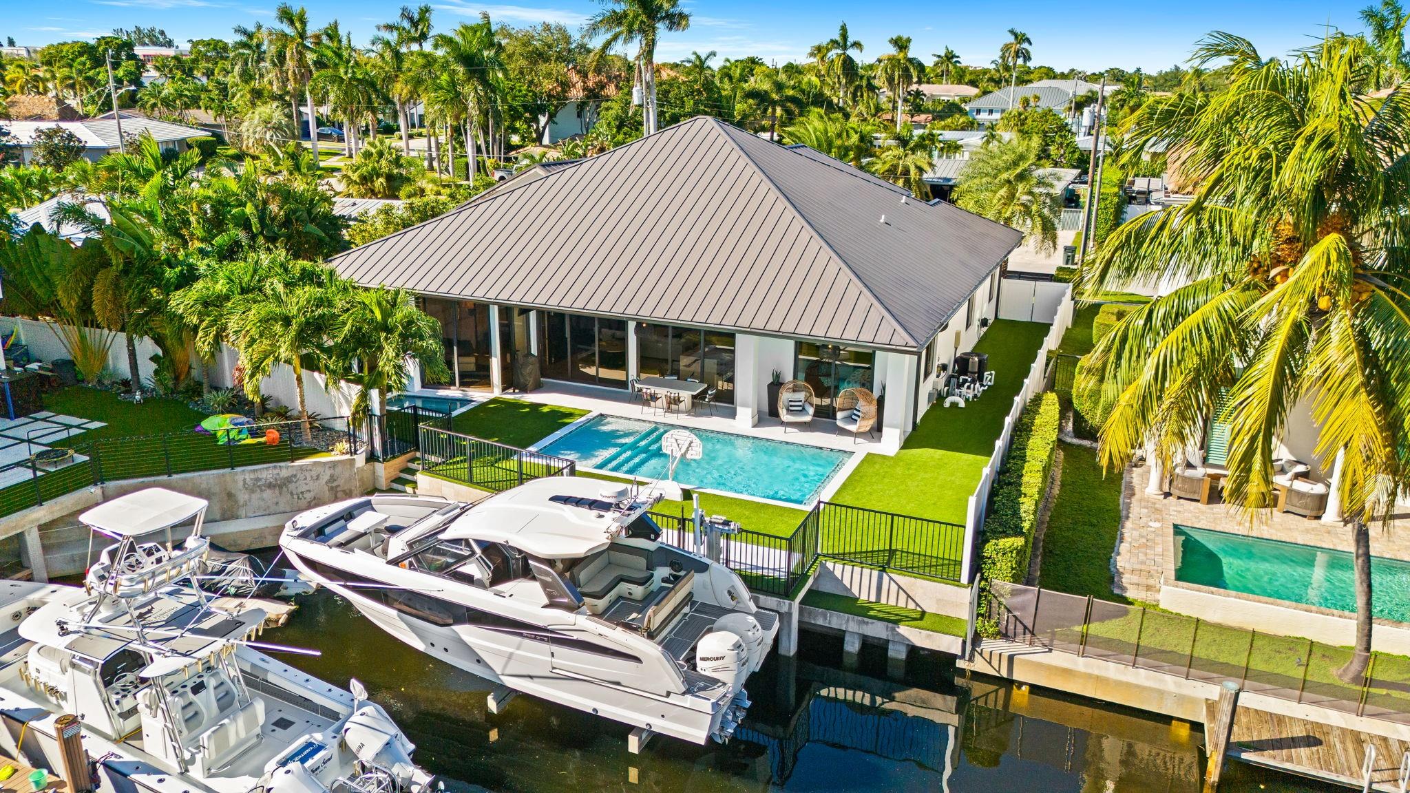 Experience elevated coastal living in this stunning 5-bed/5-bath waterfront residence with approximately 4342 total sq ft. Built in 2016 in the coveted Boca Harbor community, this home features a main-floor primary suite, direct ocean access, ideal southern exposure, and 50' of dockage. Interiors captivate with soaring 20+ ft ceilings, an open-concept layout, custom shiplap details, and a gourmet kitchen with floor-to-ceiling cabinetry and premium Miele appliances. Sunlit living spaces transition seamlessly through triple sliders to an outdoor oasis designed for entertaining, complete with artificial turf, a NEW saltwater pool & spa, a 20,000-lb boat lift, and an air-conditioned 2 car garage. A refined blend of luxury, comfort, & premier waterfront living moments from the Intracoastal.